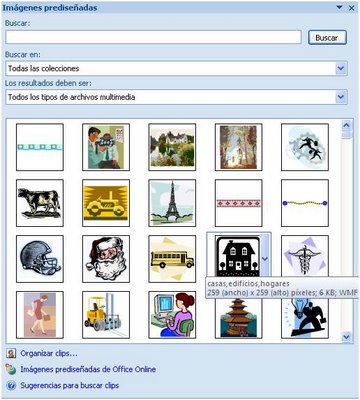 Si hace clic en Imágenes prediseñadas aparece el panel lateral de Imágenes prediseñadas, que puedes ver en esta imagen de al lado. En el cuadro Buscar debe introducir las palabras que describan lo que busca, si lo deja en blanco, aparecerán todas la imágenes disponibles.
